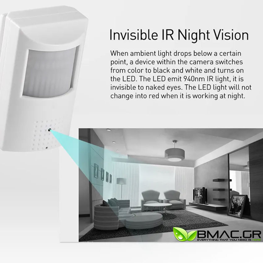 Αυθεντική κρυφή κάμερα pinhole 2MP της BMC ,POE / ethernet και ενσωματωμένο μικρόφωνο, εντός ανιχνευτή κίνησης PIR, που λειτουργεί πλήρως. Σταθερός φακός 4.3mm, ρυθμιζόμενη βάση στήριξης, αισθητήριο 1/2.8’’ , auto shutter speed, AGC, 3DNR, White Balance, D-WDR, BLC, HLC, Defog, OSD menu, privacy masking. Για τον ενσωματωμένο ανιχνευτή κίνησης PIR: εμβέλεια ανίχνευσης ως 15 m, γωνία κάλυψης 90°, Τροφοδοσία 12DC / POE 48V , κατανάλωση PIR 5 – 14 mA / κάμερας 120 mA, (ΠxBxY) 61x38x123 mm.
